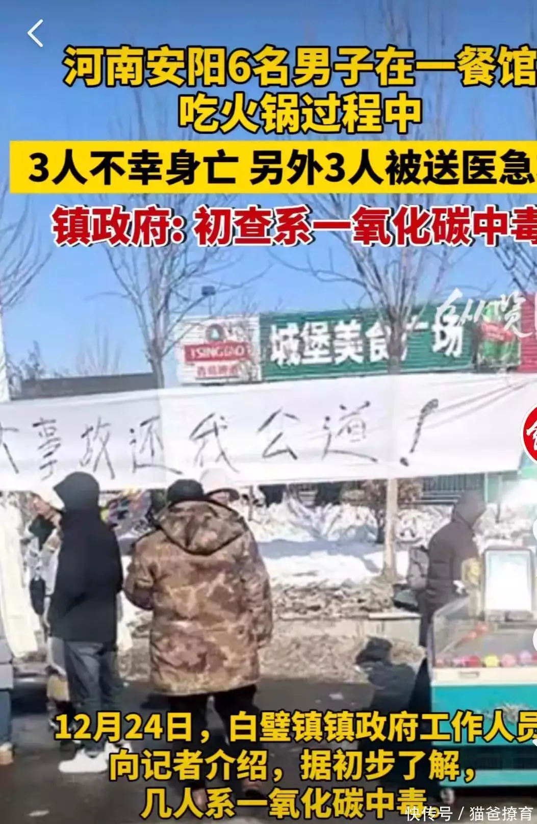 事后那不省人事的三个人已经确认死亡(其中一人回到家中以后死亡,一人在饭店内死亡,一人在医院死亡),当地镇政府回应三死三伤,系一氧化碳中毒,也就是我们常说的煤气中毒。事情发生后,一些媒体人了解了一些具体情况。