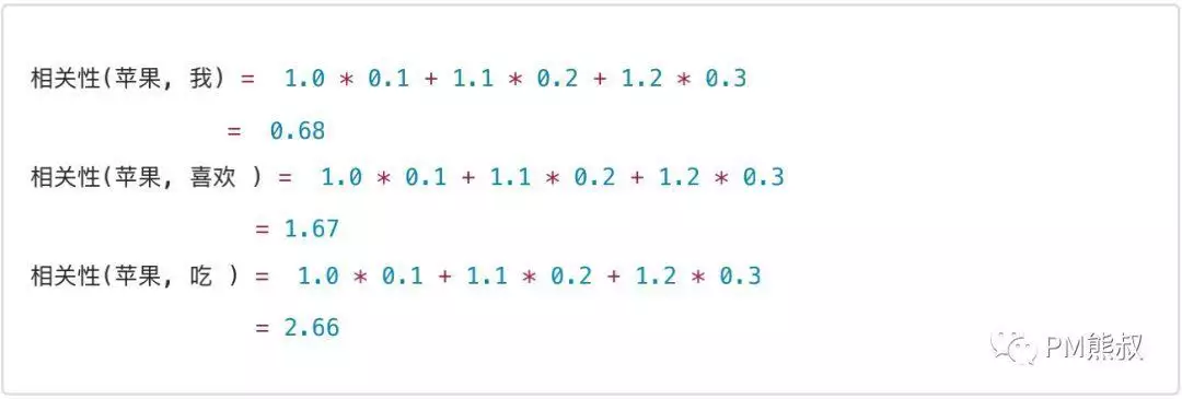 语言模型可以用数学方法来分别计算“苹果”与“我”“喜欢”“吃”三个词的权重分数,我们可以通过向量的点积计算方式模拟计算一下,值越大代表的是向量的相关性越大: