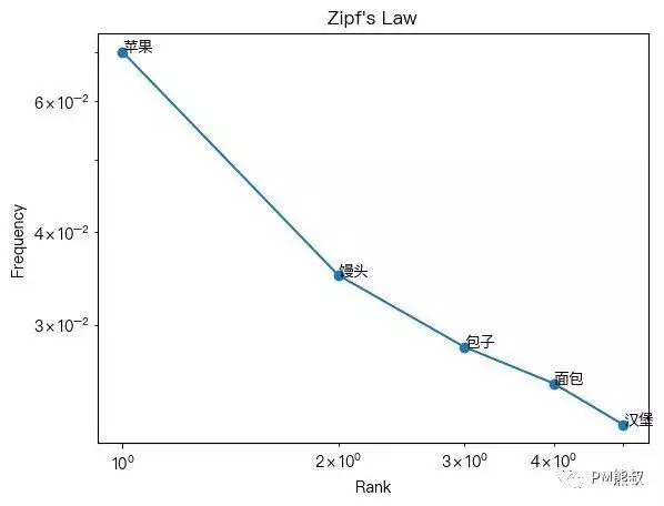它可能会扩写出“苹果”,“馒头”、“面包”、“汉堡”。根据大量的文本统计,这些词出现频率大致如下图: