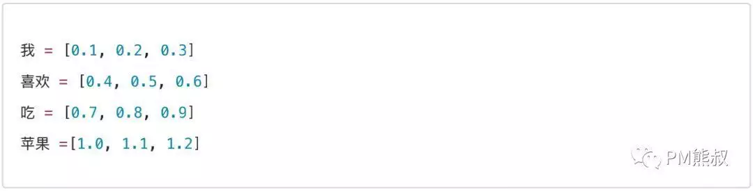 假设我们有个三维的词向量空间,我们先把“我”、“喜欢”、“吃”、“苹果”这4个词嵌入到这个空间里面: