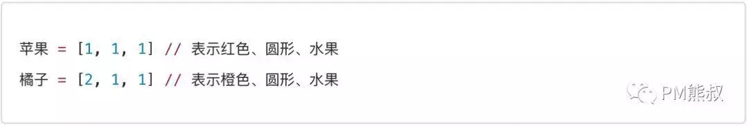 “苹果”和“橘子”都属于水果类别,因此它们在类别维度上的值相同都是用数字“1”表示;但“苹果”的颜色是红色用数字“1”表示,而“橘子”的颜色是橙色用数字“2”表示;至于形状维度,由于“苹果”和“橘子”的形状都是圆形,都用数字“1”表示,于是有下面这个数值。