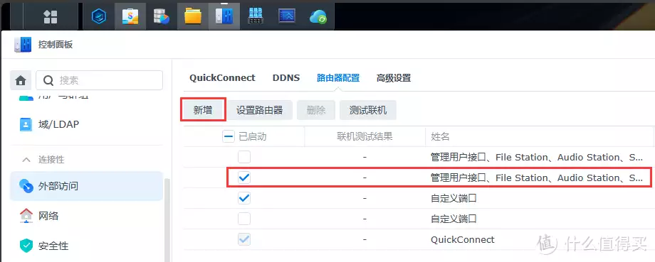 按照“控制面板”—“外部访问”—“路由器配置”路径,勾选上DSM的HTTP/HTTPS端口