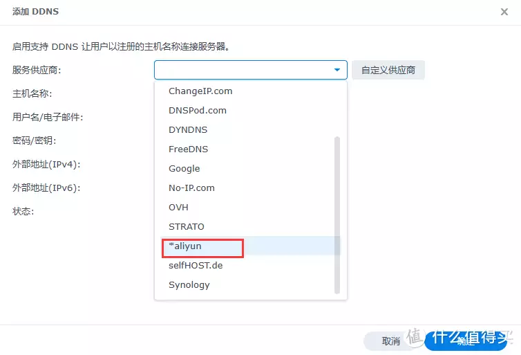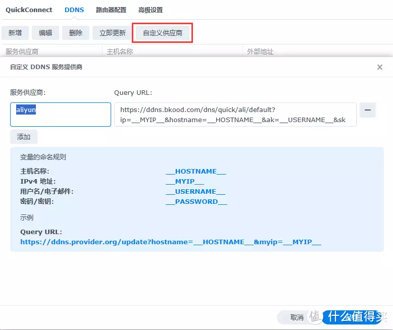 在白裙有quickconnect的情况下,至少可以保底外网访问,但是通过DDNS可以吃满自己的宽带上传,最大程度的保证外网访问的效率。而黑裙也可以通过自定义供应商的方式获取系统自带的DDNS服务。当然,我们也可以通过安装套件或者docker版本的DDNS-GO等软件实现域名解析。