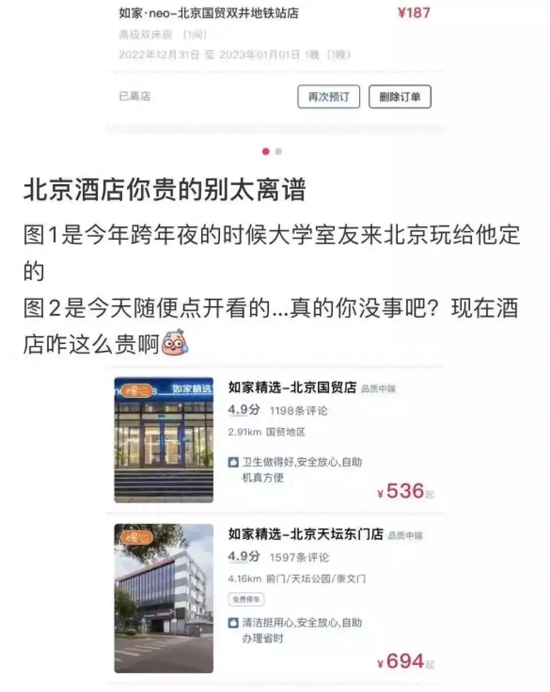 >还有细心的网友将跨年夜和现在的价格进行对比,跨年夜北京国贸地区的如家还是187元,最近却涨到了600多,短短半年时间,酒店就学会了“川剧变脸”。