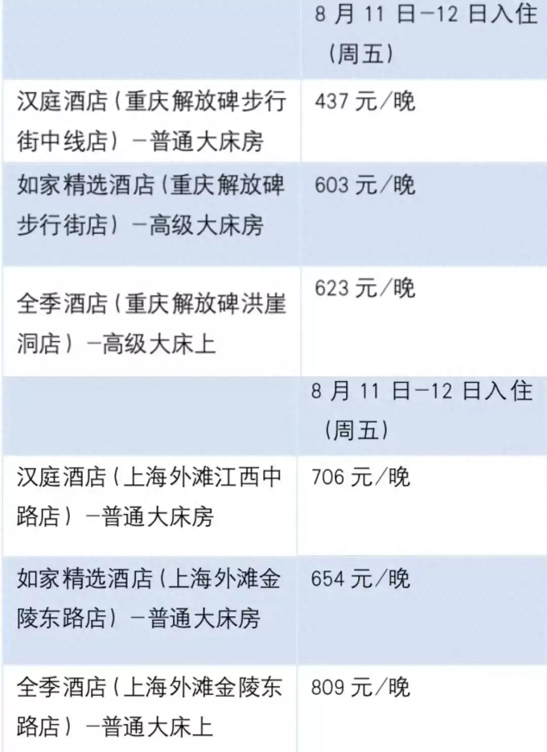 涨价潮来势汹汹,全国各地,几乎无一幸免。在热门旅游地重庆,搜索解放碑附近酒店,汉庭、如家精选、全季酒店暑期价格在400~600元/晚之间。