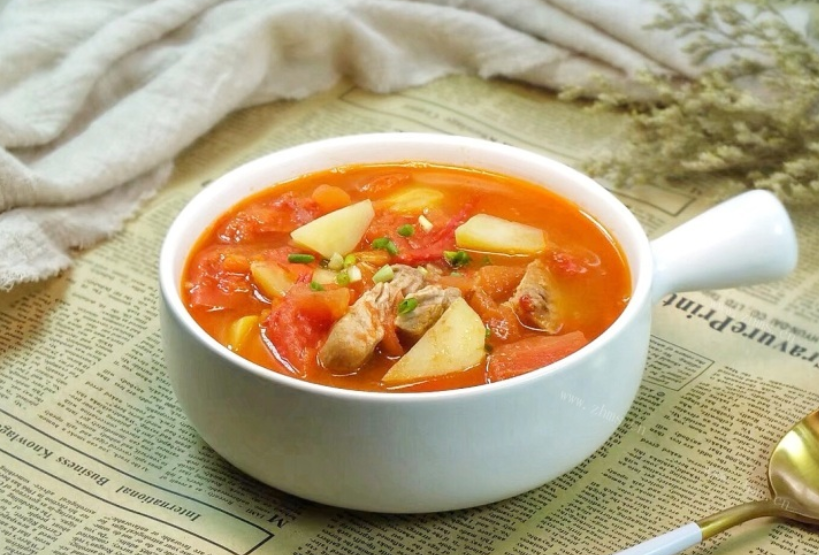 材料:排骨500克,番茄250克,番茄酱40克,姜片少许,盐适量,料酒1小匙。做法:1、排骨在清水中适当的泡一泡,以泡去多余的血水,然后洗净;2、洗好的排骨需要汆烫2分钟,捞起用凉开水冲去血水、血沫备用;3、取来汤锅,置火上,加适量开水,放入姜片,排骨,料酒,炖至排骨烂熟,这个过程大概需要1-1.5小时;4、待排骨烂熟时,再加入番茄,番茄酱,盐,再炖上一会就可以关火盛出了。在炖肉的时候,如果早放盐的话,肉则不易炖烂,所以盐要后放~番茄可根据自己的需要提前放入,如果希望口感更好,外观更好,最好把番茄的皮撕去。做这道汤的时候,不必放花椒、大料等调料,甚至连料酒都可以不放,只需姜片和番茄自然的酸甜味就可起到去腥提鲜的作用,调料放的太多反倒会掩盖番茄自然的香味。 08