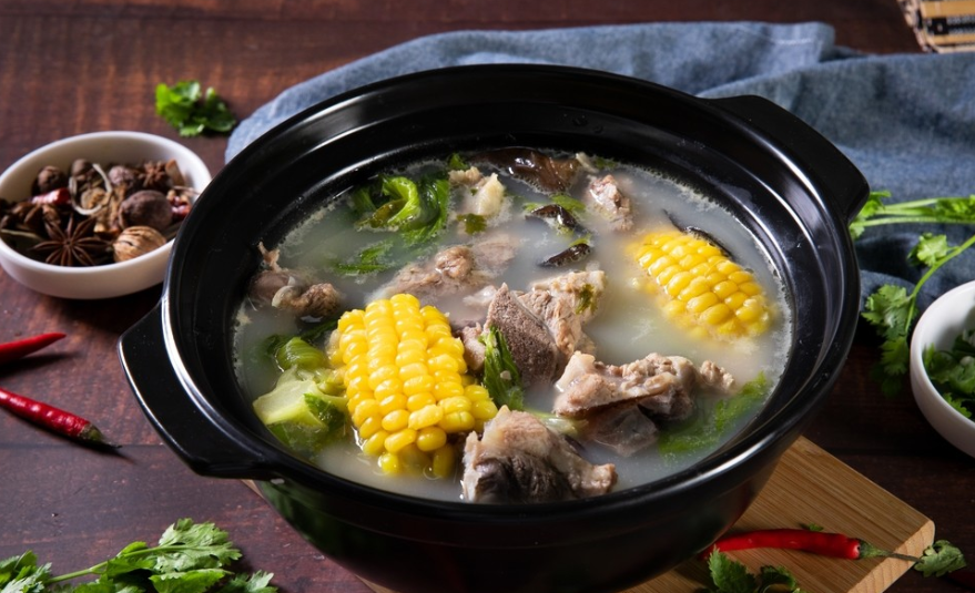 材料:玉米、猪肋排 、葱、姜、盐。做法:1、将排骨剁成块状,长短随意。2、玉米去皮、去丝,切成小段。3、葱切段,姜切片。4、砂锅内放水,将水烧开,将锅内的血沫子倒掉(烧开即可)5、往锅里倒油,爆炒一下排骨,倒水(若想排骨汤鲜些,可在水中滴两滴醋)加玉米,姜(无需太多一两片即可)一起放入锅中,滴入少许白酒,大约煮40分钟。6、煲熟,加入少许盐调味即可。 02