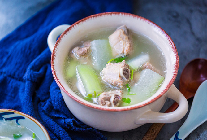 材料:冬瓜200g,猪排骨100g,香油、葱、姜、花椒、食盐、味精各适量。做法:1、冬瓜去皮,洗净,切块。2、猪排骨洗净,剁块。3、葱洗净,切段。生姜洗净,切片。花椒研细。4、将猪排骨放入锅中,加清水适量煮沸后,去浮沫,下冬瓜及葱、姜、椒等调味品。5、煮至排骨、冬瓜熟后,下食盐,味精,再煮一二沸即成,最后淋上香油。 06