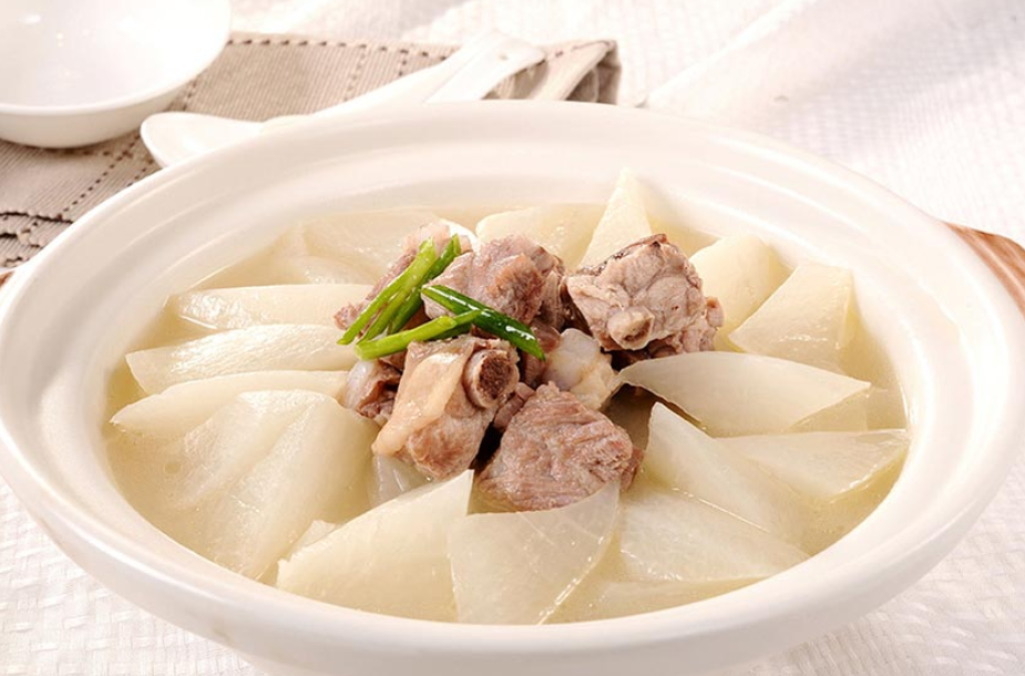 排骨、白萝卜、 葱、姜、枸杞、盐。制作步骤:1、萝卜切小块、葱白切段、葱绿切葱花、姜切片。2、冷水放入排骨、一半量的姜片,焯一下排骨,排骨捞出冲洗干净。3、排骨、玉米、剩余姜片、葱白放入电饭煲,加水。4、煮至水去了1/3,将葱白捞出。5、放萝卜,放适量盐调味继续煮至萝卜熟。6、加枸杞,出锅前撒上少许葱花即可。 09