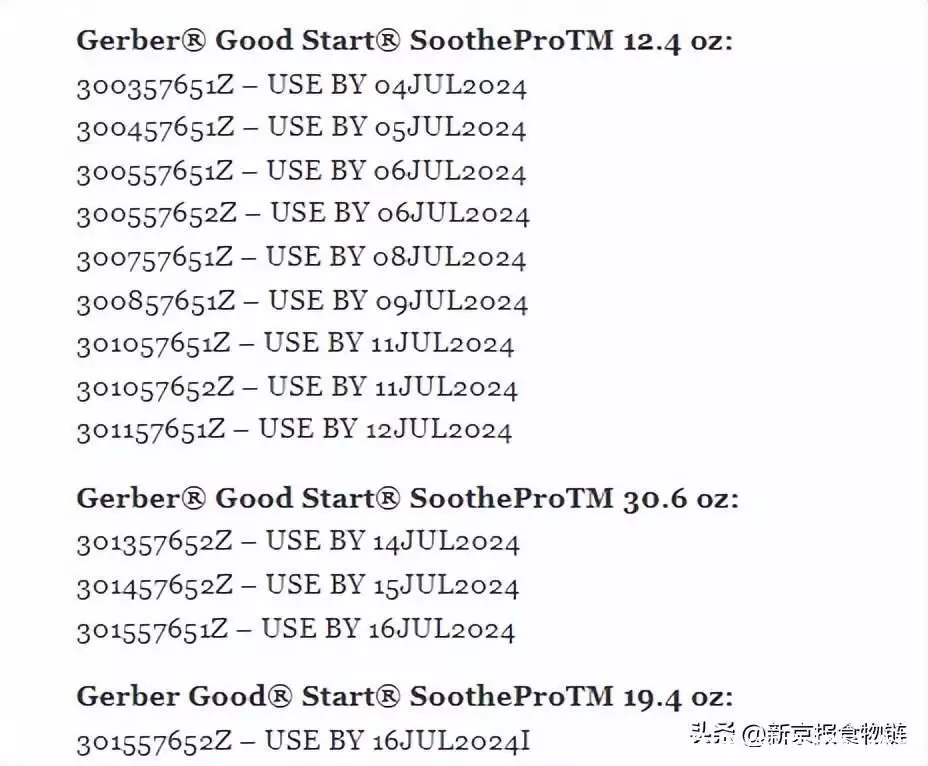 召回信息显示,百利高公司在美国市场召回的奶粉涉及Gerber Good Start SoothePro品牌12.4盎司、30.6盎司、19.4盎司3种规格,保质期在2024年7月,共计13个批次。相关产品在美国各地零售商处销售,消费者可注意查看包装底部的有效期。