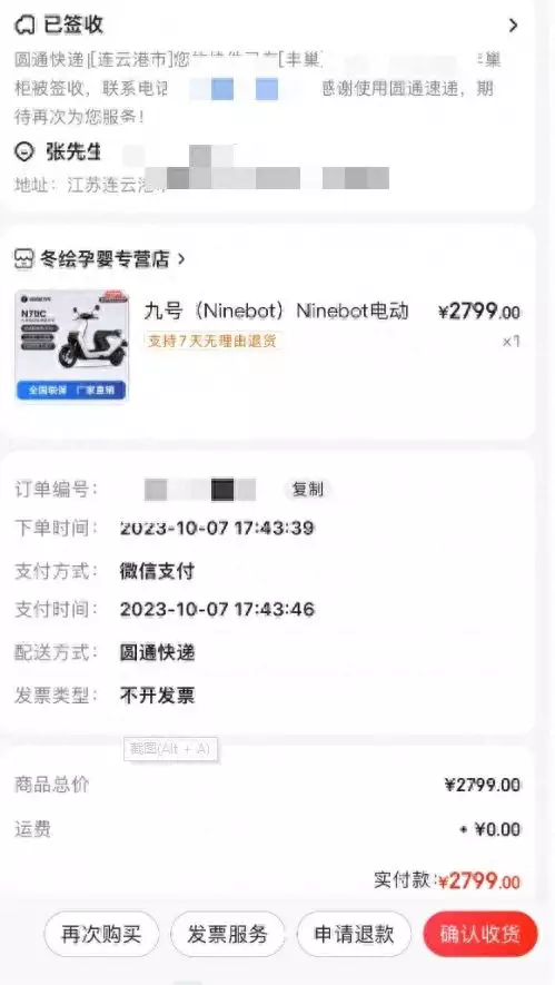 张先生告诉晨意帮忙记者,10月7日,他在京东平台上一家名为冬绘孕婴专营店的店铺内,付款2799元购买了一台电动车。“我没有在官方店铺购买,是一个第三方卖家,因为我比价发现,比官方店铺便宜了三四百元。”