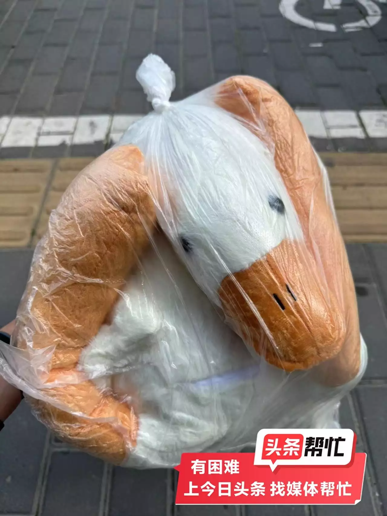 张先生手中的大白鹅玩偶,包裹在塑料袋里,因挤压变形。很难想象,这是他花费2799元购买的“电动车”。