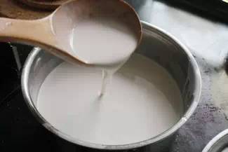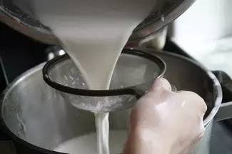 7.沉淀后的洗面水,上面的水是清的,面粉都沉淀到盆下了。把上面的清水倒掉。然后用勺子将沉在盆底的面搅匀,把面水用筛子过一遍,筛掉面水里的面疙瘩。