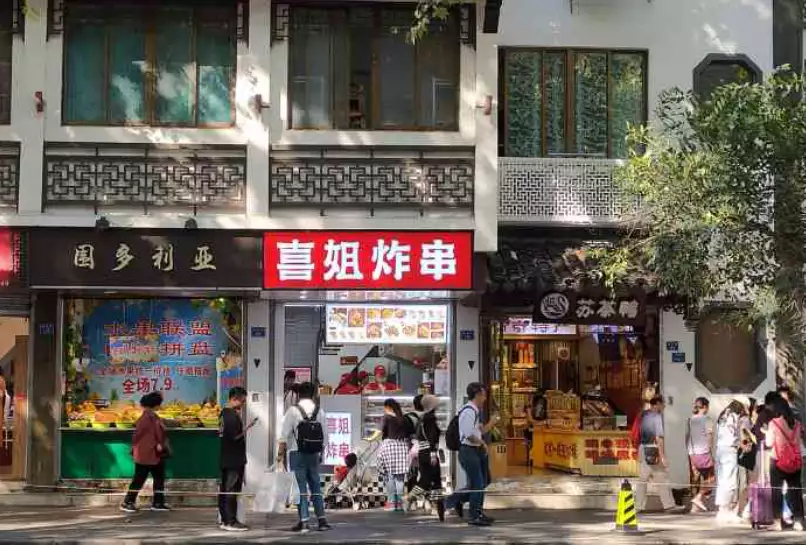 2019年,喜姐炸串在南京新街口开了第一家门店,门店只有9平米,顾客却排了十几米的队,巅峰期甚至要排队2小时。