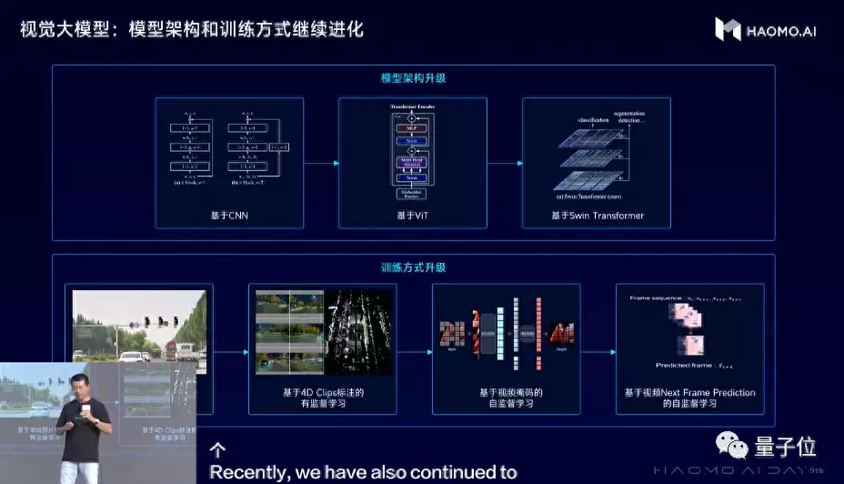 视觉感知网络架构,从之前ViT(Vision Transformer)为代表的大模型,升级到性能更强大的Swin Transformer大模型。从训练范式上,毫末率先采用基于大规模数据的自监督学习训练范式,采用Transformer大模型轻松“吃下”上百亿的图片,模型变得见多识广,泛化能力极强,逐渐可以识别万物。