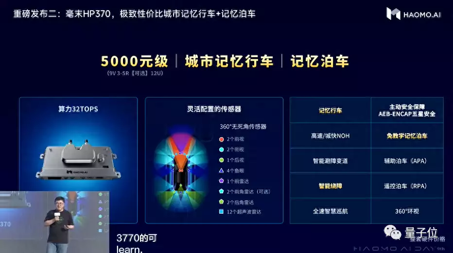 毫末HP370,5000元级,实现的功能同样是“极致性价比”。除了高速、城市快速路的NOH,还支持城市内的记忆行车功能。泊车层面也有升级,实现免教学记忆泊车、智能绕障。