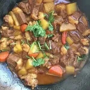油温6成热将土豆煎金黄,加西红柿翻炒,加牛肉焖10分钟,盛出撒上香菜即可。