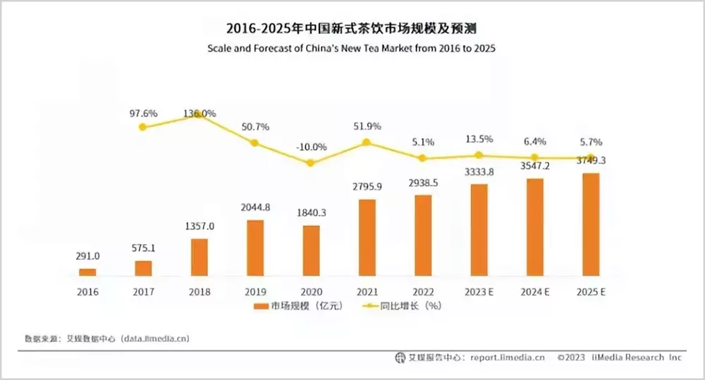 2016年-2022年现制饮品的黄金时代,据艾媒咨询数据,中国新式茶饮市场的规模在此期间从291亿增长到2938.5亿,6年时间翻了10倍。2022年至2023年是一道分水岭,此后行业增速将快速下滑,预计2024年和2025年增长率将分别降至6.4%和5.7%。进一步参考其他机构的相关报告,尽管具体数据有差异,但饮品行业整个增速放缓几乎已成为共识。