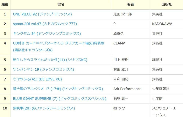 在这次榜单中,前三依次是《航海王》第92卷、《spoon.2Di vol.47》、《王者天下》第54卷,后三名是《苍蓝钢铁的琶音》第17卷、《BLUE GIANT SUPREME》第7卷、《黑执事》第28卷。