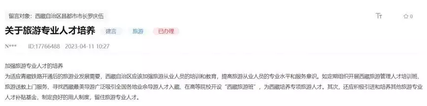 留言表示,应定期组织开展西藏旅游管理人才培训班、旅游送教上门服务、寻找西藏最美导游,广泛吸引全国各地业余导游人才入藏;在高等院校开设“西藏旅游班”,为西藏培养专项旅游人才。此外,还应积极引进和培养其他旅游专业人才补贴基金,制定良好的用人制度,留住旅游专业人才。