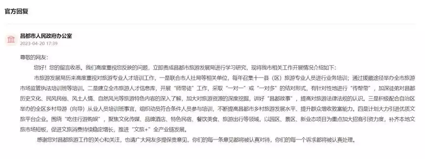 收到留言后,昌都市人民政府高度重视,立即责成昌都市旅游发展局进行学习研究,并将昌都市相关工作开展情况向网友进行反馈。