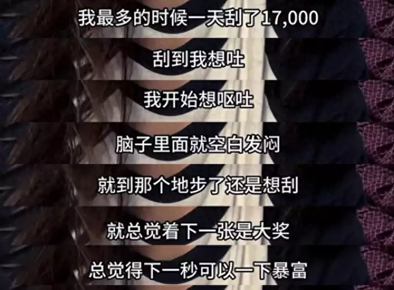 在回忆自己当时的疯狂时,她说“连续看了好几遍《孤注一掷》,刮到想吐,脑袋发闷”、“总觉得下一张是大奖,下一秒可以暴富”。
