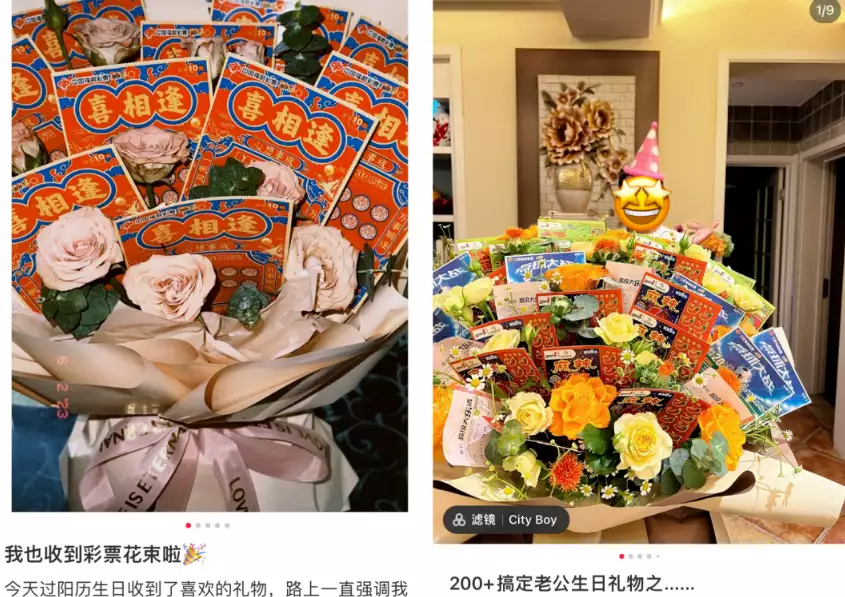 彩票也玩起了定制,与你乐透同行”定制版彩票上写着“520”专属标志;各路商家也加入其中,“刮刮乐”花束成了最潮生日礼物。