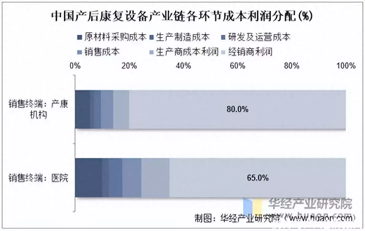 产后康复设备以经销为核心销售渠道,主要销售终端包括产康机构与医院。产后康复设备行业产业链各环节的成本与利润分配呈现以下特征:(1)产后康复设备生产总成本占销售终端价格比重的15%-20%;(2)经销商的利润分配比重较生产商更大;(3)由于不同销售终端的产品售价不同,各类产品的利益分配结构存在差异。经销商在非医用设备中的获利更高,利润占比为80.0%,显著高于医疗专用器械的65.0%。