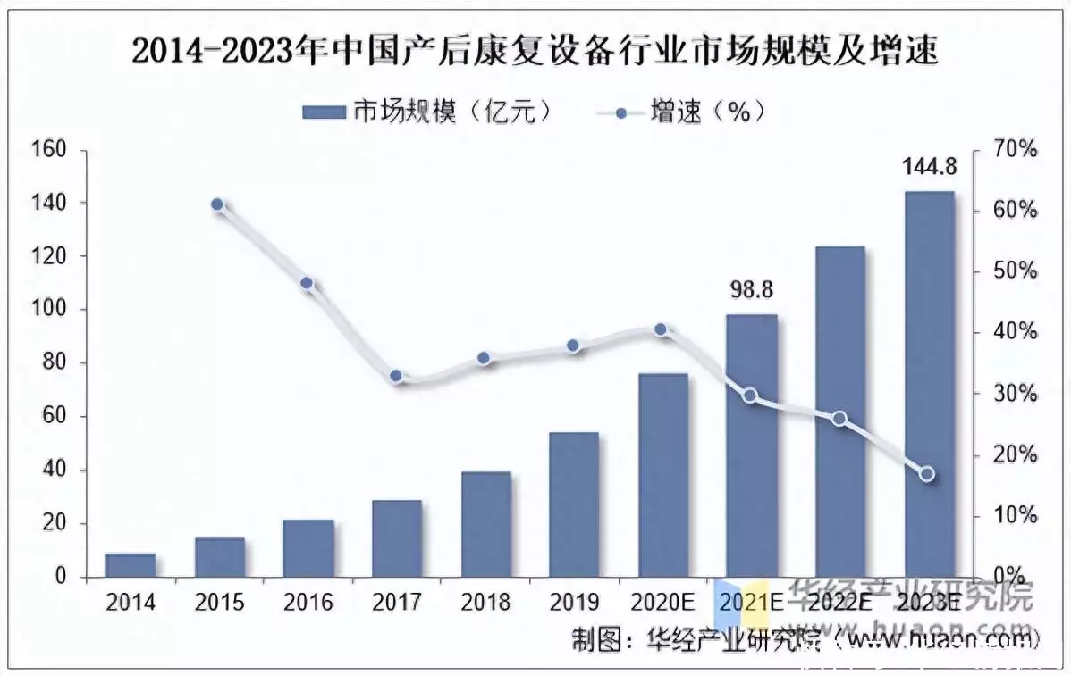 从市场规模来看,2014年至2021年我国产后康复设备行业市场规模由9.2亿元快速增长至98.8亿元,年均复合增长速度为40.37%。预计2023年市场规模有望达到144.8亿元。