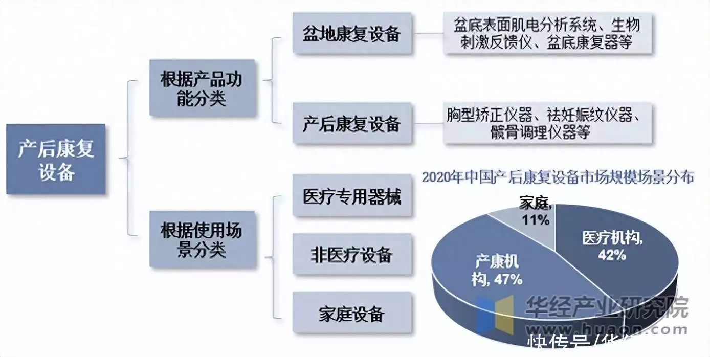 产后康复设备主要通过生物刺激和电刺激等物理治疗方法刺激局部神经肌肉,激活细胞组织,在疗程内恢复肌肉组织的弹性与紧张度。产后康复设备包括医疗专用器械、非医疗设备、家庭设备,分别应用于医院、产康机构、家庭等场景,科学的产后康复有助于帮助产妇恢复身体机能、解决身材走样、产后妊娠纹等常见问题。