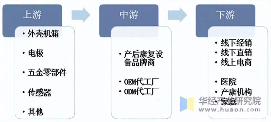 产后康复设备行业的产业链分为原材料供应、生产制造、销售与消费四个环节。其中,产业链上游的主要参与者为芯片、屏幕、五金零部件等原材料与硬件供应商;产业链中游生产制造环节的参与主体由品牌商、代工厂构成,负责产品的研发设计与生产组装;产业链下游包括销售与消费两个环节,销售主体有品牌商、代理商,主要消费者包括医院、产康机构、家庭用户。