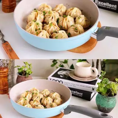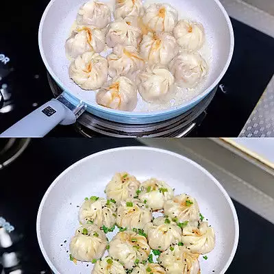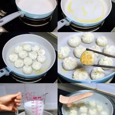 3、平底煎锅底部刷一层薄油,中小火,锅预热后摆入包好的包子,煎至底面金黄,倒入淀粉水,没过包子的三分之一高度即可,盖盖子中小火焖至汤汁收尽,根据包子大小不同,焖