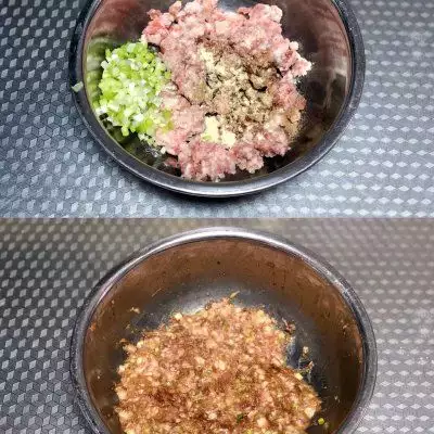1、先来准备馅料,三肥七瘦的肉馅儿中加入适量大葱碎,生抽,蚝油,十三香,姜粉(或姜末),盐搅拌均匀,最后加入适量食用油搅匀调成肉馅儿