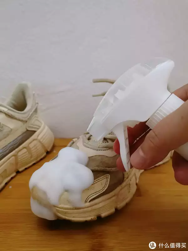 如果鞋子的污渍面积不是特别大,或者不想水洗鞋子的话,用泡沫就可以实现干洗。首先关闭喷口的网盖,然后对准污渍处按压喷出泡沫,绵密的泡沫让鞋子污渍快速瓦解,可以轻松用刷子刷干净,最后用毛巾或者纸巾擦干即可;