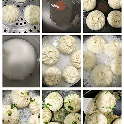 10、拿了三个二发好的直接去蒸,凉水下锅水开上汽蒸13分钟关火焖3分钟左右,图一是蒸好的样子,娃想吃水煎包所以煎了5个水煎包,平底锅倒适量油,放入二发好的包子,煎至底部金黄下入提前调好的面粉水(面粉和水的比例大概是1:20),面粉水倒的大概没过包子2/3多一点,然后盖盖子焖,期间要不停转动锅以免一个地方一直加热导致烧糊了,水分快干的时候转小火转动锅收干水分,撒葱花芝麻,全程大概10分钟左右,边缘的脆皮真的又香又脆