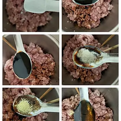 4、调馅:盐,生抽,老抽,白胡椒粉,太太乐鸡精,香油