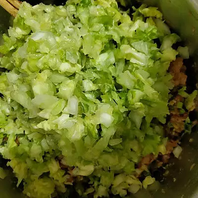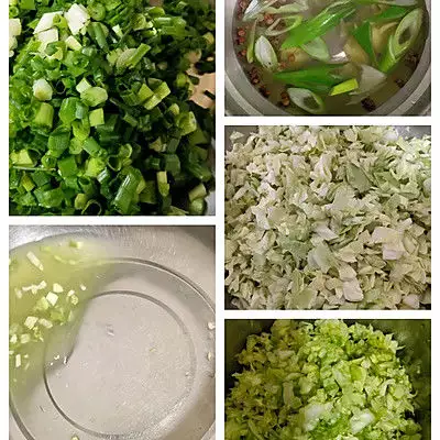 2、面团发酵的时间先准备肉馅配料:先把葱花切好备用,葱姜花椒用开水冲泡放凉,卷心菜洗净切小丁加一勺盐拌匀腌十分钟左右杀杀水分,十分钟之后将卷心菜里的水分挤干备用