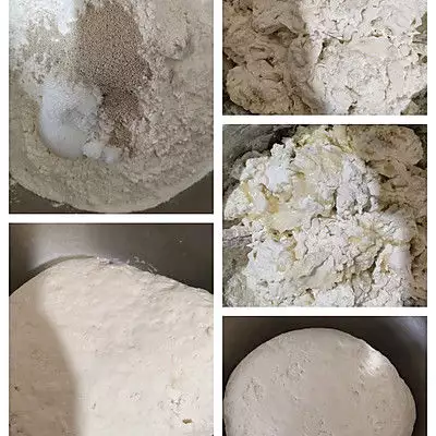 1、先做面团部分:称量好面粉,糖,酵母,清水(不同面粉吸水性不同,可以预留20克左右的水根据面团的干湿程度再决定加不加)边倒边搅拌至大片面絮状,然后倒入食用油揉成团,比较粗糙也没有关系盖盖子醒发10分钟后再揉一次就可以盖保鲜膜温暖处发酵至两倍大