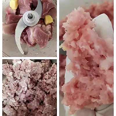 3、面团发酵的时间再准备肉馅,将后腿肉洗净切块,放入绞肉机,也切一小块姜一起打,肉馅打成颗粒状即可