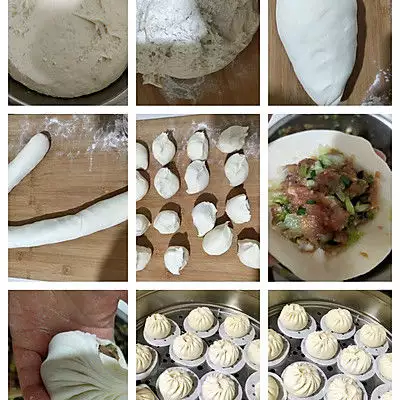 8、面团发酵至两倍大取出来,案板上撒一层薄面粉,放上面团,揉面排气6分钟左右,搓长条分剂子,擀面皮包馅,温暖处再次发酵20分钟左右,总共包了31个包子