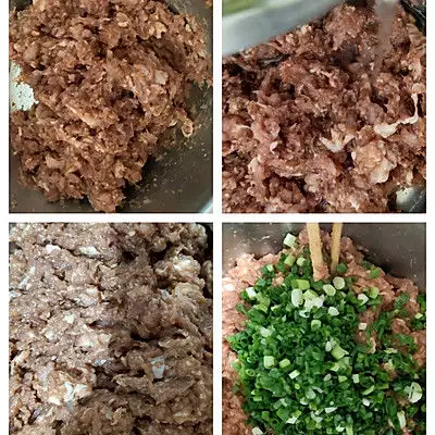 5、搅拌3-5分钟让肉馅上劲,之后葱姜花椒水过滤掉葱姜花椒,就留泡好的水,分次倒入,每次都要搅拌至完全吸收了再倒下一次,之后倒入葱花拌匀