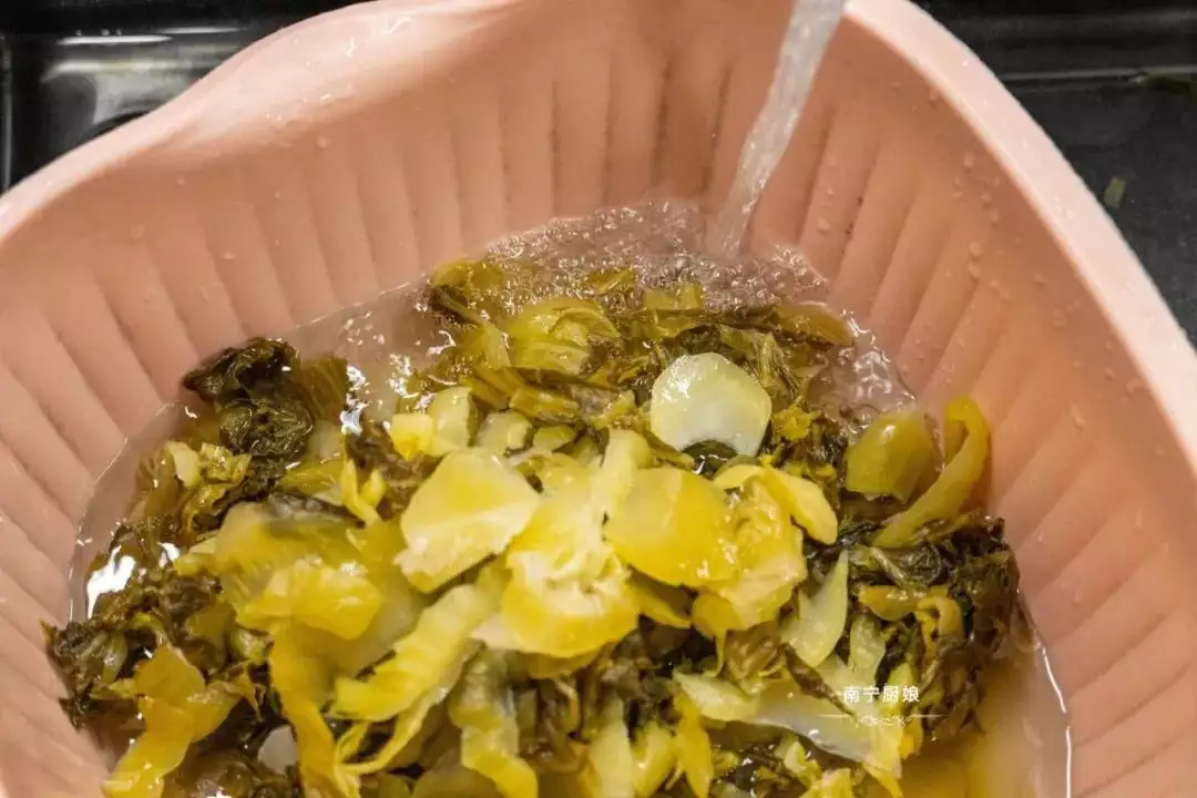 3.酸菜比较咸,需要用清水浸泡,去除咸味,然后挤掉水分把酸菜切碎。