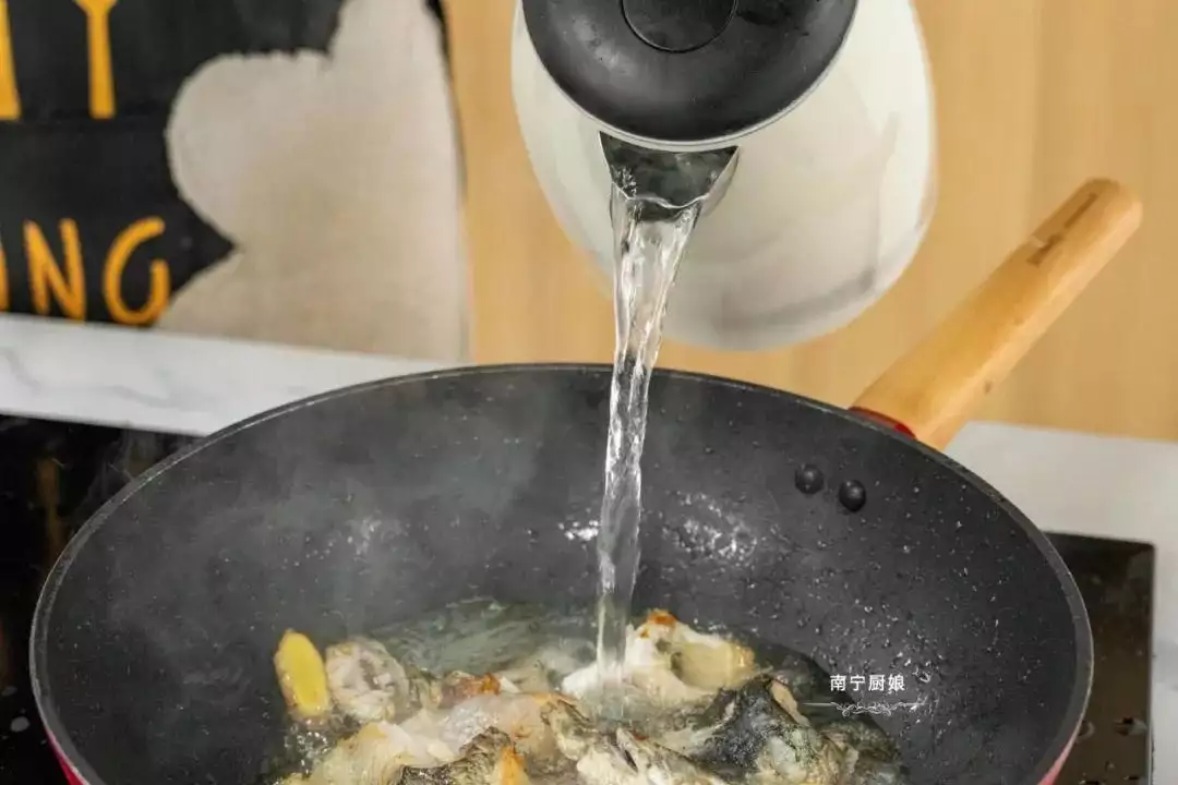 7.等水开之后加入鱼片。鱼片要一片片地下,而且速度要快,否则最先下锅的鱼片已经老了。