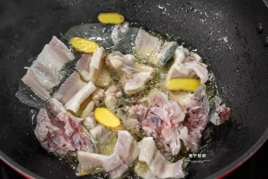 5.起锅烧油,把姜片和之前的鱼头鱼骨一起煎至两面金黄。