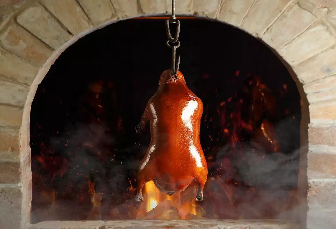 国宴美味,礼宴贵宾,严选正宗白洋淀白羽填鸭,肉质肥美,经过48小时低温风干,北京名厨秘制,香酥不腻!并采用名堂挂炉,在250℃以上炙烤80分钟,从而达到肉质香嫩。