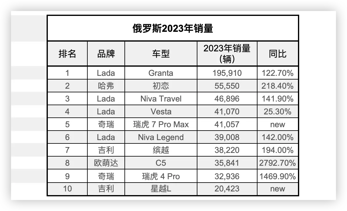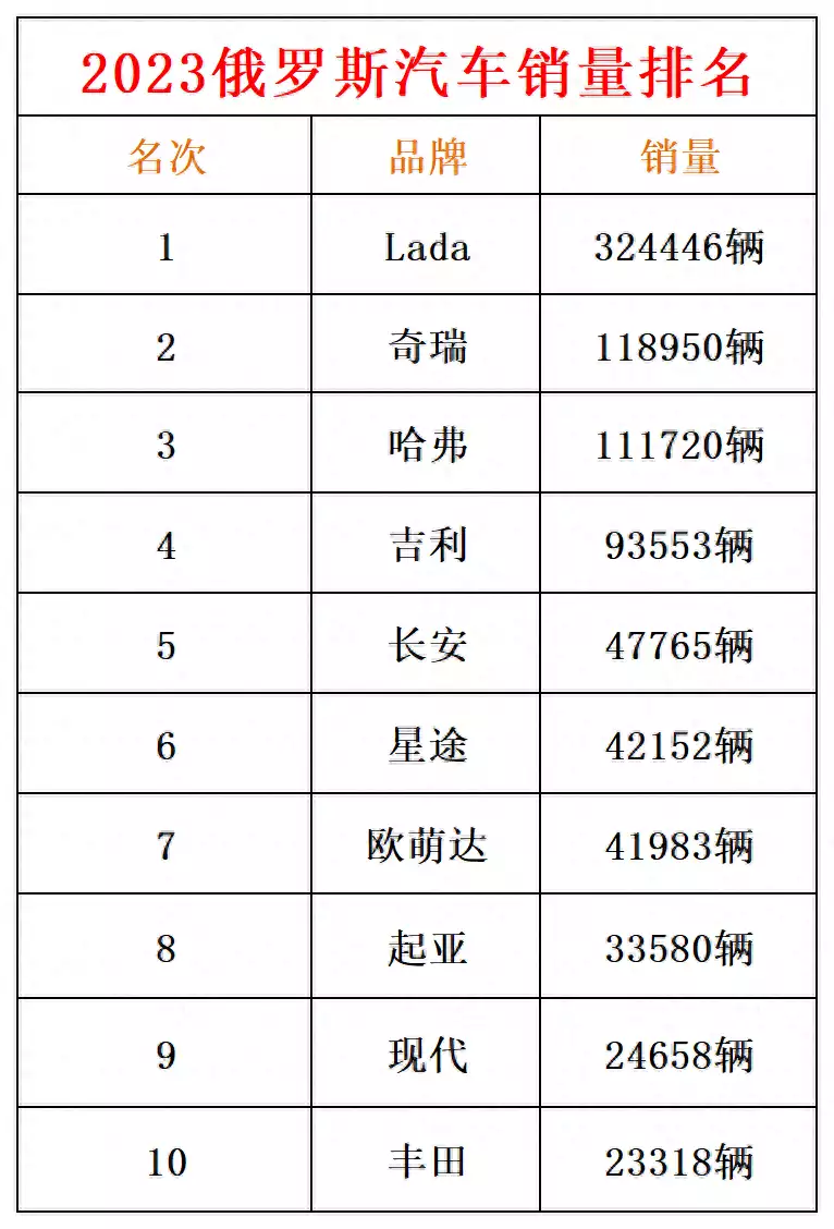 第一名是俄罗斯本土品牌Lada,销量为32.4万辆,第二名是奇瑞,销量为11.9万辆,第三名是哈弗,销量为11.2万辆,第四名是吉利,销量为9.3万辆,第五名是长安,销量为4.7万辆,第六名是星途,销量为4.2万辆,第七名是欧萌达,销量为4.1万辆,第八名到第十名,则是起亚、现代和丰田。