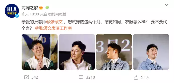 28日早间,男装品牌海澜之家的官方微博发了这样一条动态,“亲爱的张老师,您试穿的这两个月,感觉如何,衣服怎么样?要不要代言?”并@了张颂文及张颂文表演工作室。随后,当日下午该品牌又通过微信公众号发文,正式宣布张颂文为品牌代言人并发布代言海报,配文:“专注演戏二十年,依然踏实演好每个角色”。