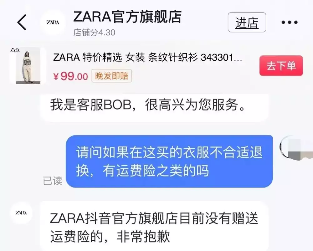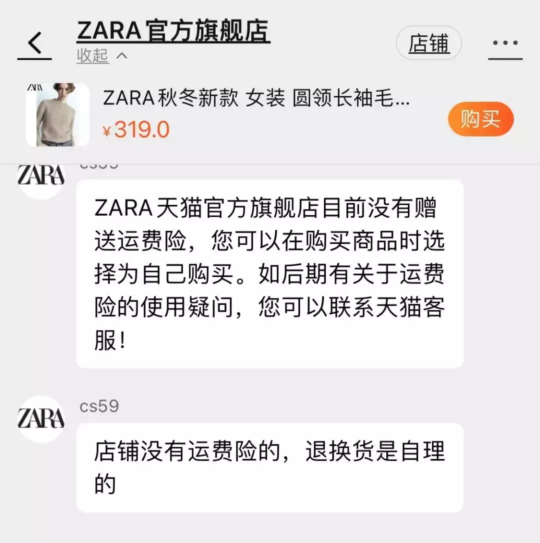 除了自营渠道,ZARA线上渠道还有天猫旗舰店和抖音旗舰店。记者分别询问了两家网店客服均被告知,目前官方旗舰店没有赠送运费险,退换货为自理。也就是说,11月27日以后,线上所有官方渠道购买的ZARA商品退换货产生的运费都由消费者自行承担。