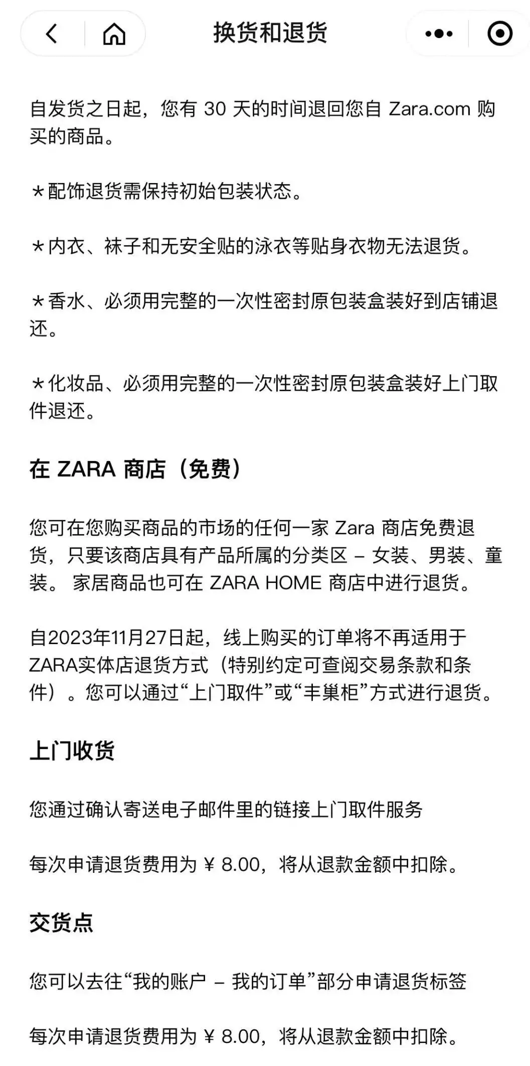北京商报记者发现,ZARA小程序“换货和退货”规则也做了同步调整,其中还提到,消费者退回线上购买订单,每次申请退货费用为8元,该笔款项将从退款金额中扣除。