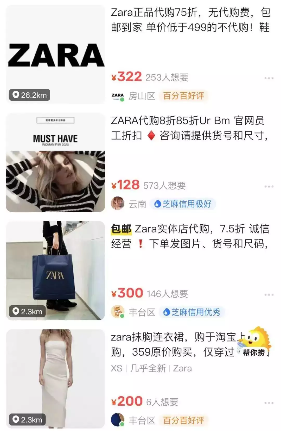 在二手平台闲鱼上搜索“ZARA代购”会出现不少相关商家。有商家介绍,可通过官网员工折扣以8-85折代购ZARA、UR、BM等快时尚品牌服装,并叮嘱收到商品要尽快检查,并不要剪掉吊牌,不要乱退货,所有商品都有独立的订单编号,乱退到其他订单,将收不到退款。